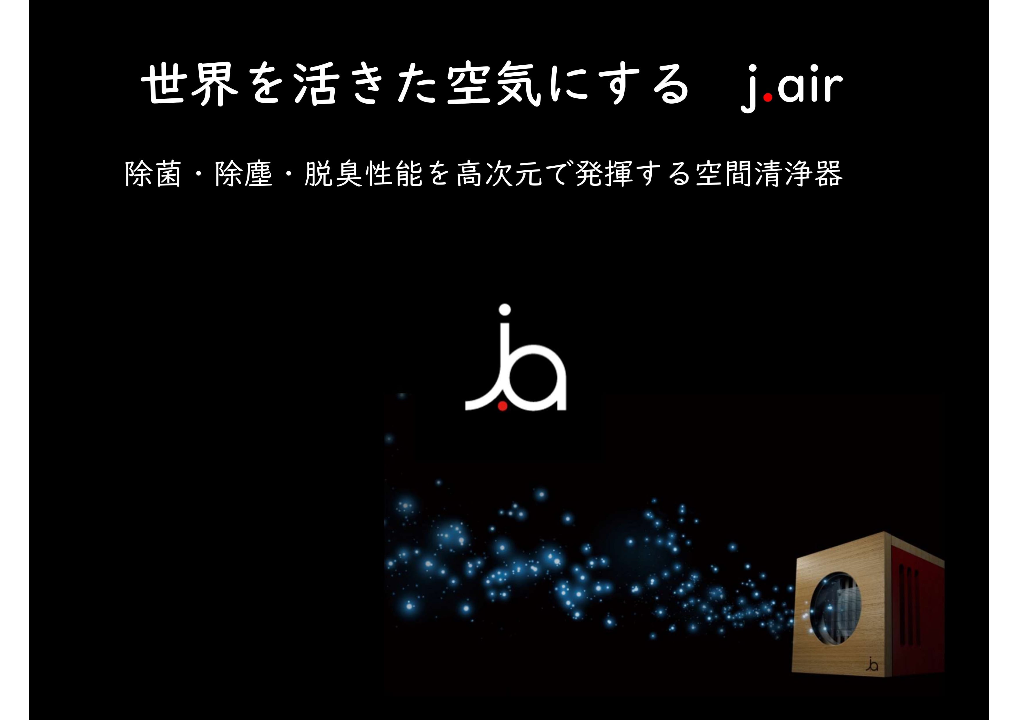 j airはフィルターもファンも薬剤も一切使用せず、独自の特許技術により空気中のチリ・菌・ニオイ成分を積極的に除去し、“生命力のある空気”を生み出します。